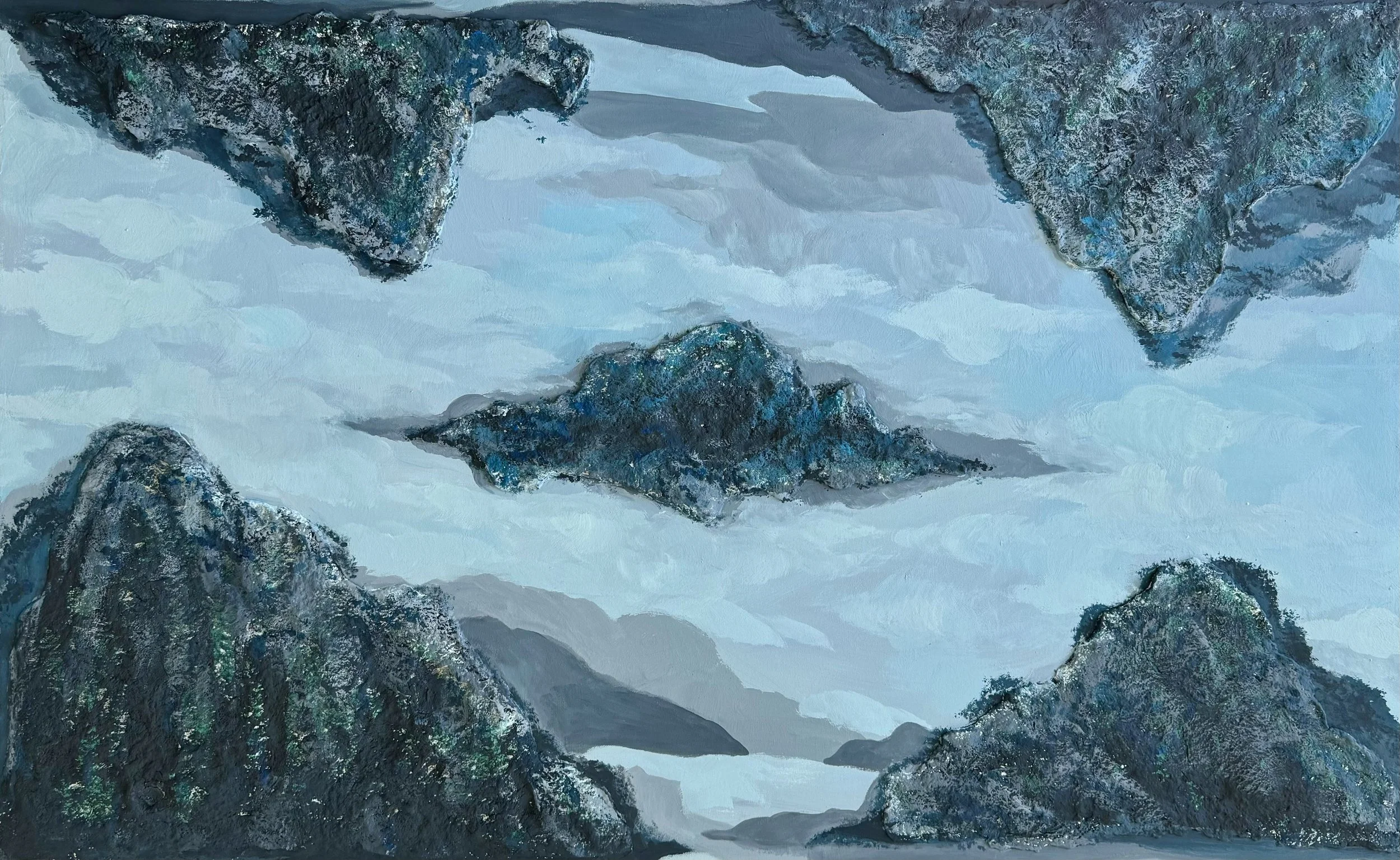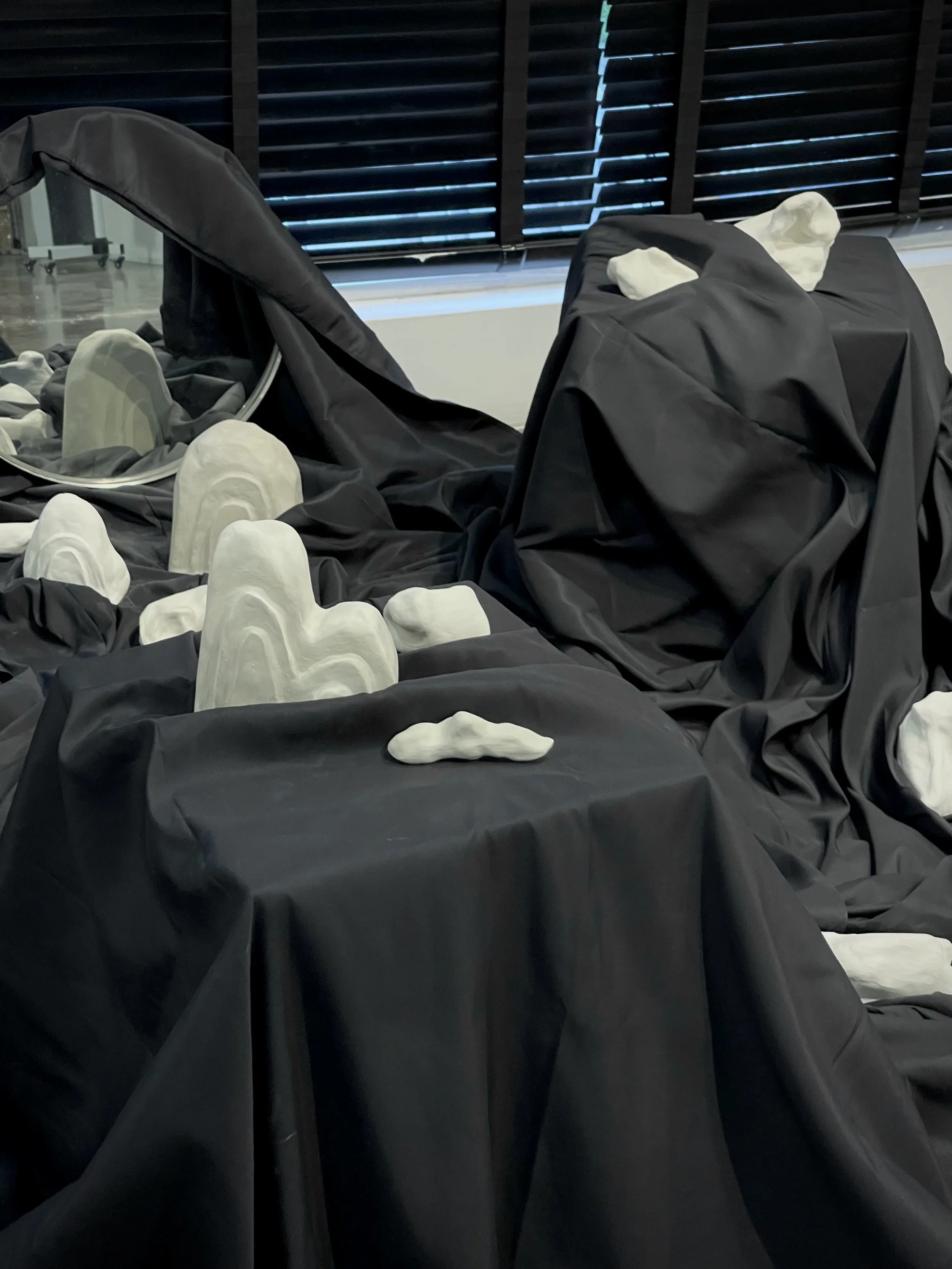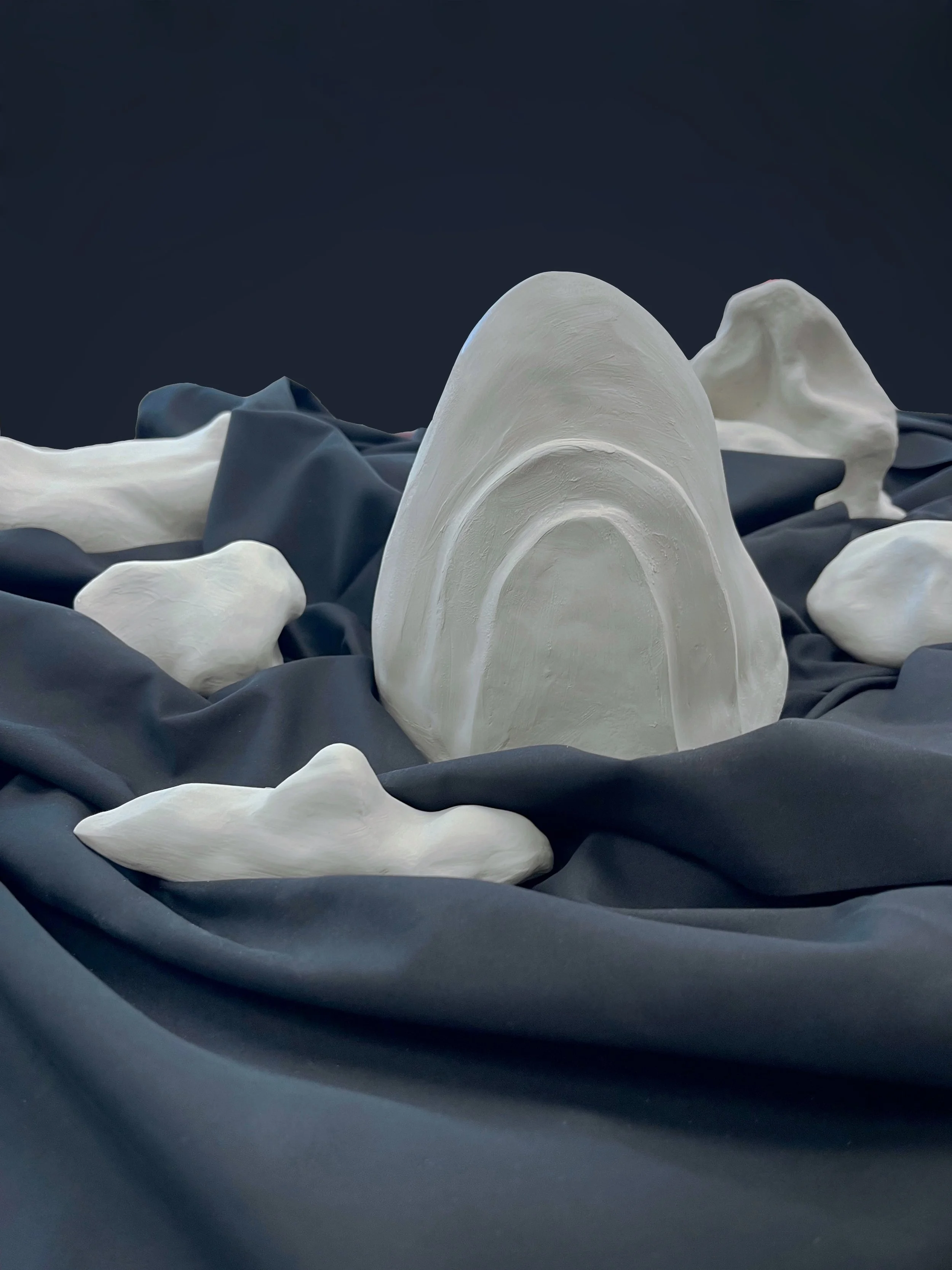 Mind-Scape presents a small black-and-white landscape, crafted meticulously to capture a world within. The main medium is porcelain clay, a personal favorite of mine. My fascination with porcelain is mostly affected by my family. They have had porcelain dinnerware for as long as I can remember. It recalls many family moments from my childhood. Within Mind-Scape, you can encounter a window into the landscape of the mind, a sanctuary of inner tranquility. The term "Scape" in "Mind-scape" can also hint at escaping from the tangible world, creating a sanctuary within our thoughts. This imagined terrain features serene mountains reminiscent of those found in traditional Chinese paintings. In these paintings, mountains symbolize a state of mind rather than a true depiction of reality. Likewise, in this piece, they stand as emblems of inner peace, their forms not confined by accuracy but guided by emotion. Besides them are ethereal clouds, weaving an atmosphere of serenity. Every element, rendered in pristine white, contrasts strikingly against the black fabric beneath, elevating the surreal landscape. The absence of color isn't a limitation but rather an exploration – a testament to the notion that enchantment can be born from the simplest palette.